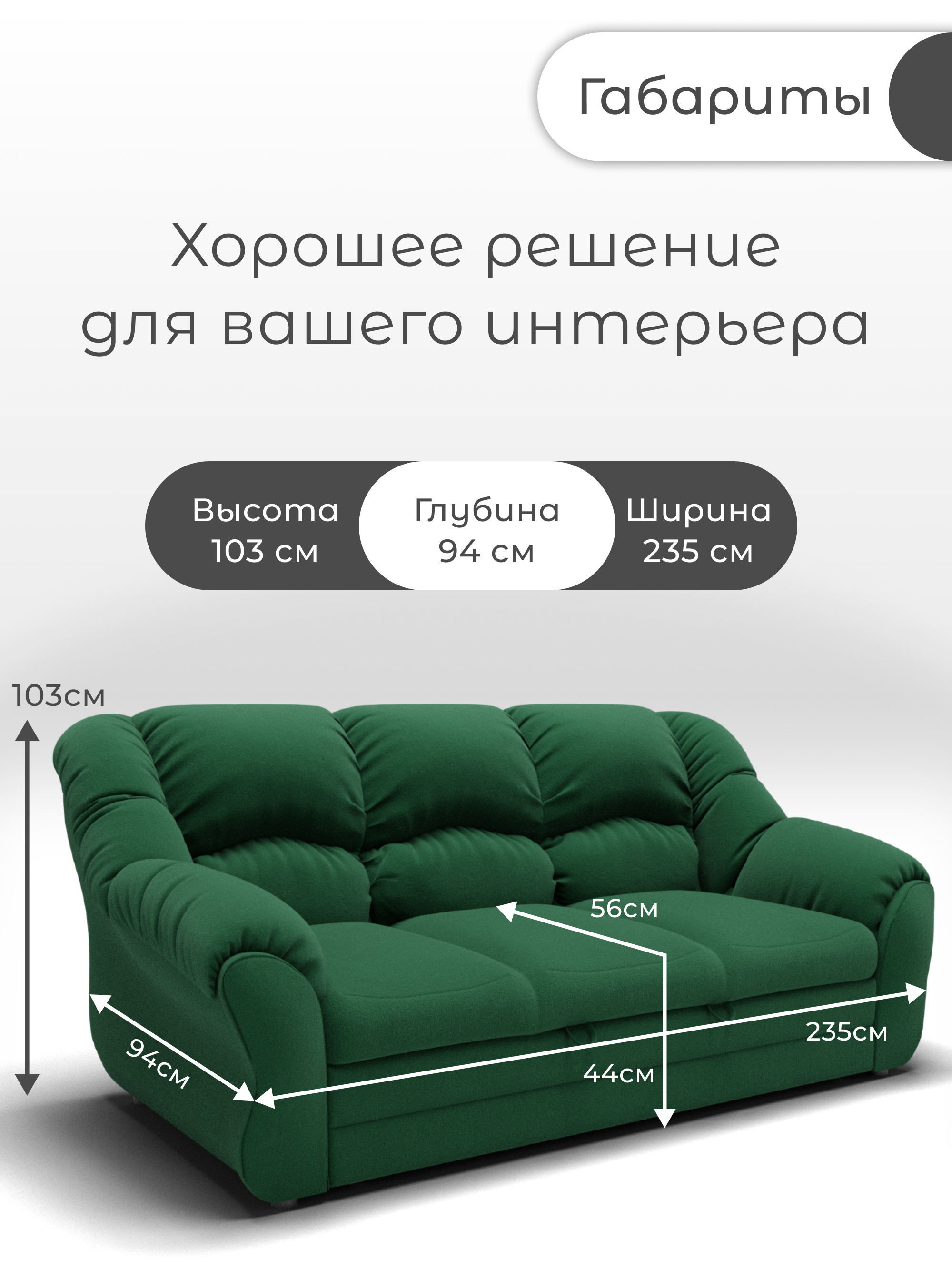 Диван «Хост-1» от бренда YORCOM – ваш комфорт гарантирован! Благодаря искусственному велюру сидение нежное к телу, а пенополистирольный наполнитель с пружинной змейкой обеспечивает устойчивость и долговечность. Габариты (ширина 235 см, глубина 94 см) создают дополнительное пространство для отдыха. Россия производит качество! Гарантия 12 месяцев, выдерживает нагрузку до 240 кг. Легко выбрать уют благодаря стильному дизайну и оптимальной высоте 103 см. Уют вашего дома начинается здесь!